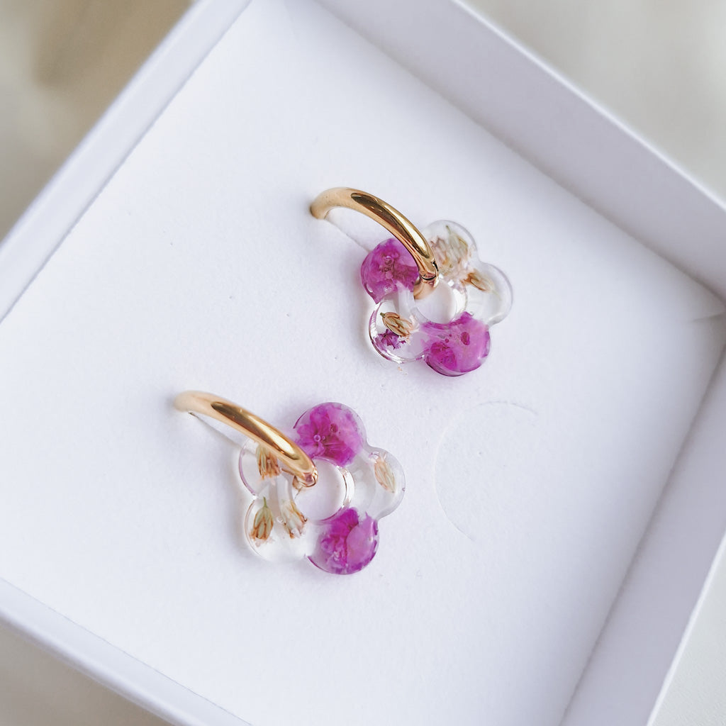Upeat kuivakukkakorut rengaskiinnityksellä. Sisällä aitoja kuivattuja kukkia, jokainen pari on uniikki! Saatavilla vain yksi pari.