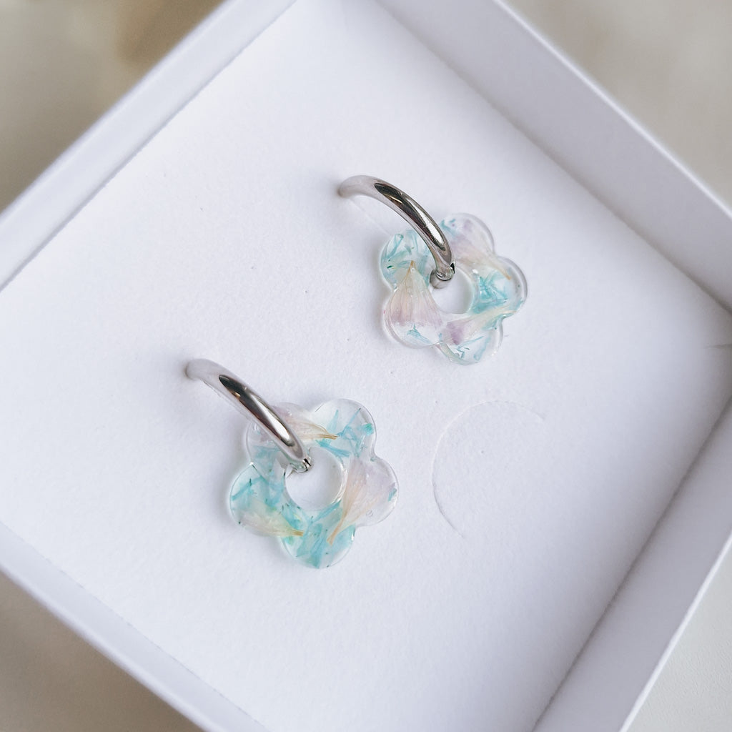 Upeat kuivakukkakorut rengaskiinnityksellä. Sisällä aitoja kuivattuja kukkia, jokainen pari on uniikki! Saatavilla vain yksi pari.