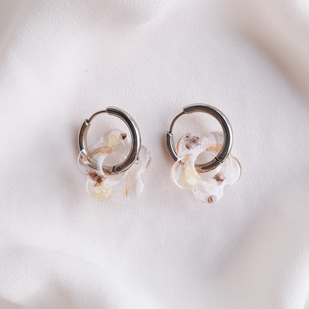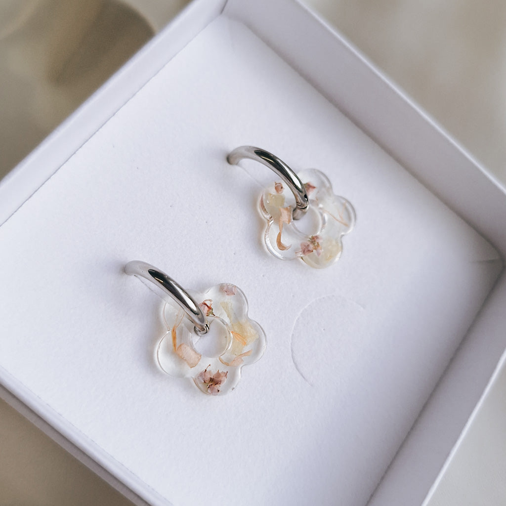 Upeat kuivakukkakorut rengaskiinnityksellä. Sisällä aitoja kuivattuja kukkia, jokainen pari on uniikki! Saatavilla vain yksi pari.