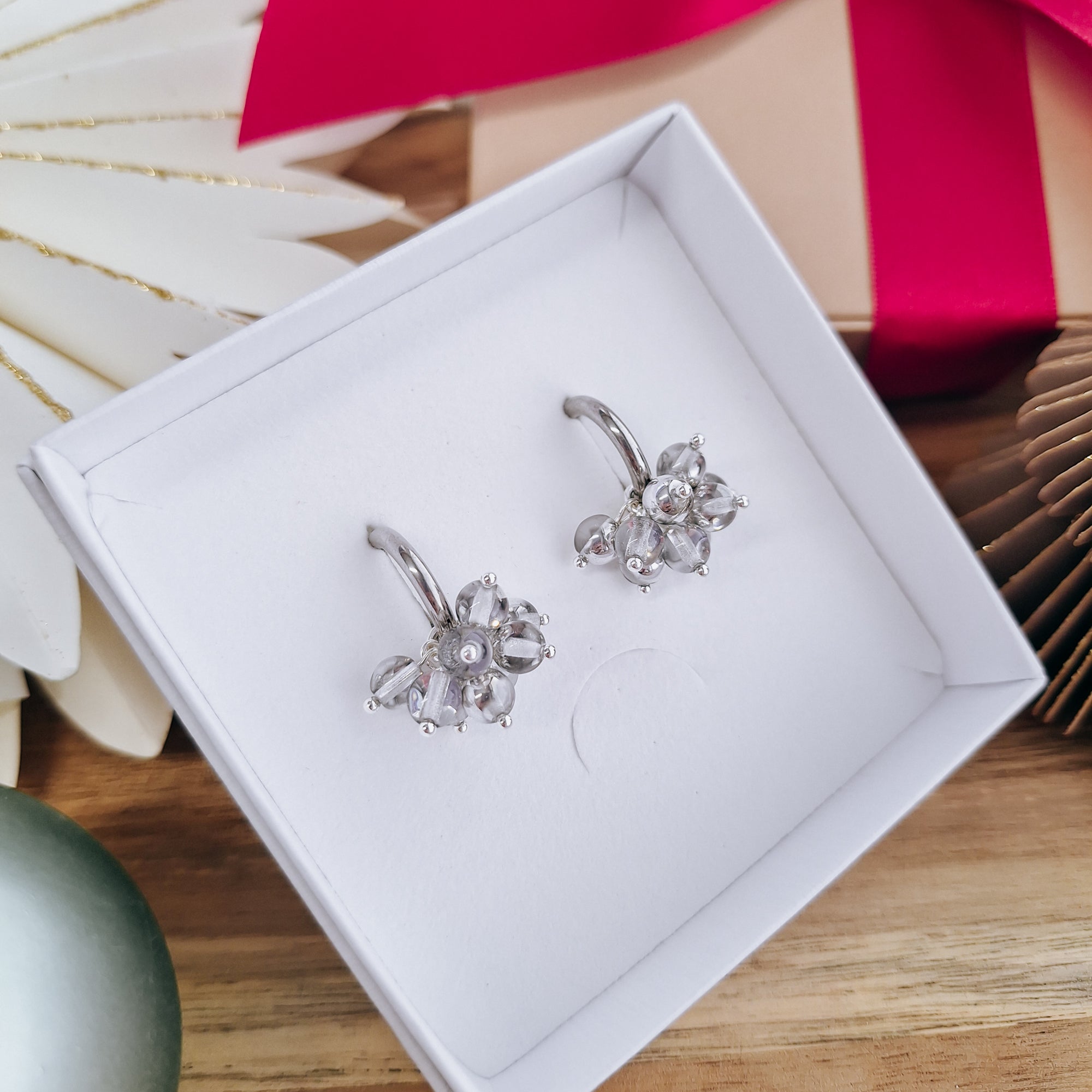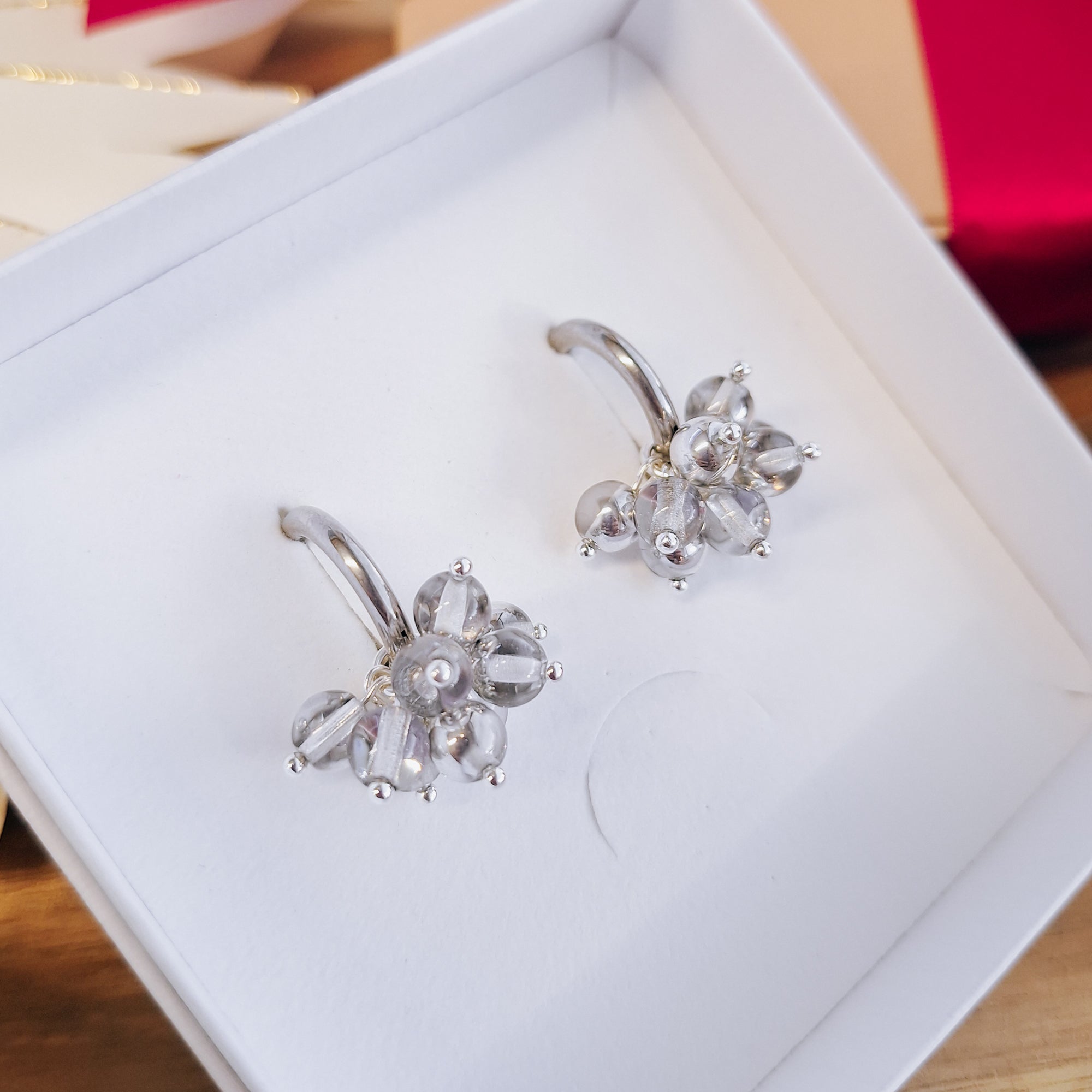 Upeat helmikorvakorut säihkyvillä hopeanvärisillä lasihelmillä.