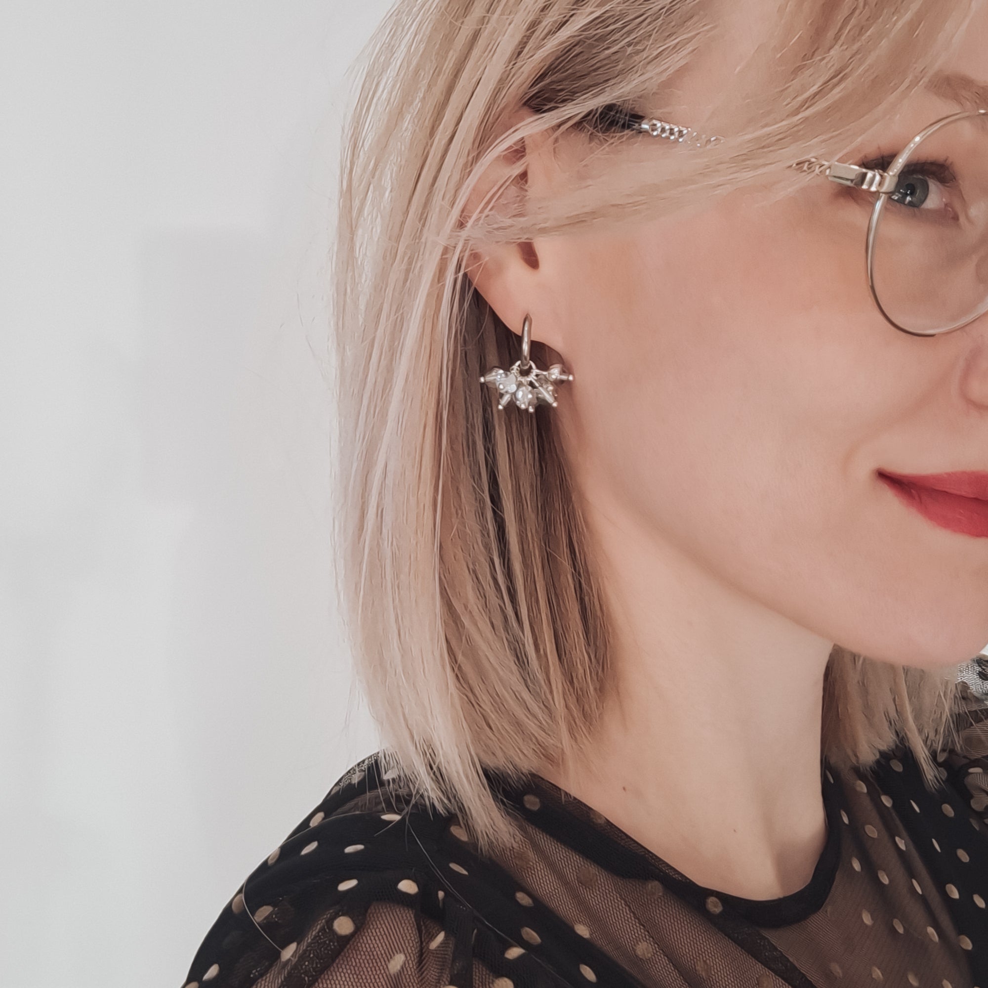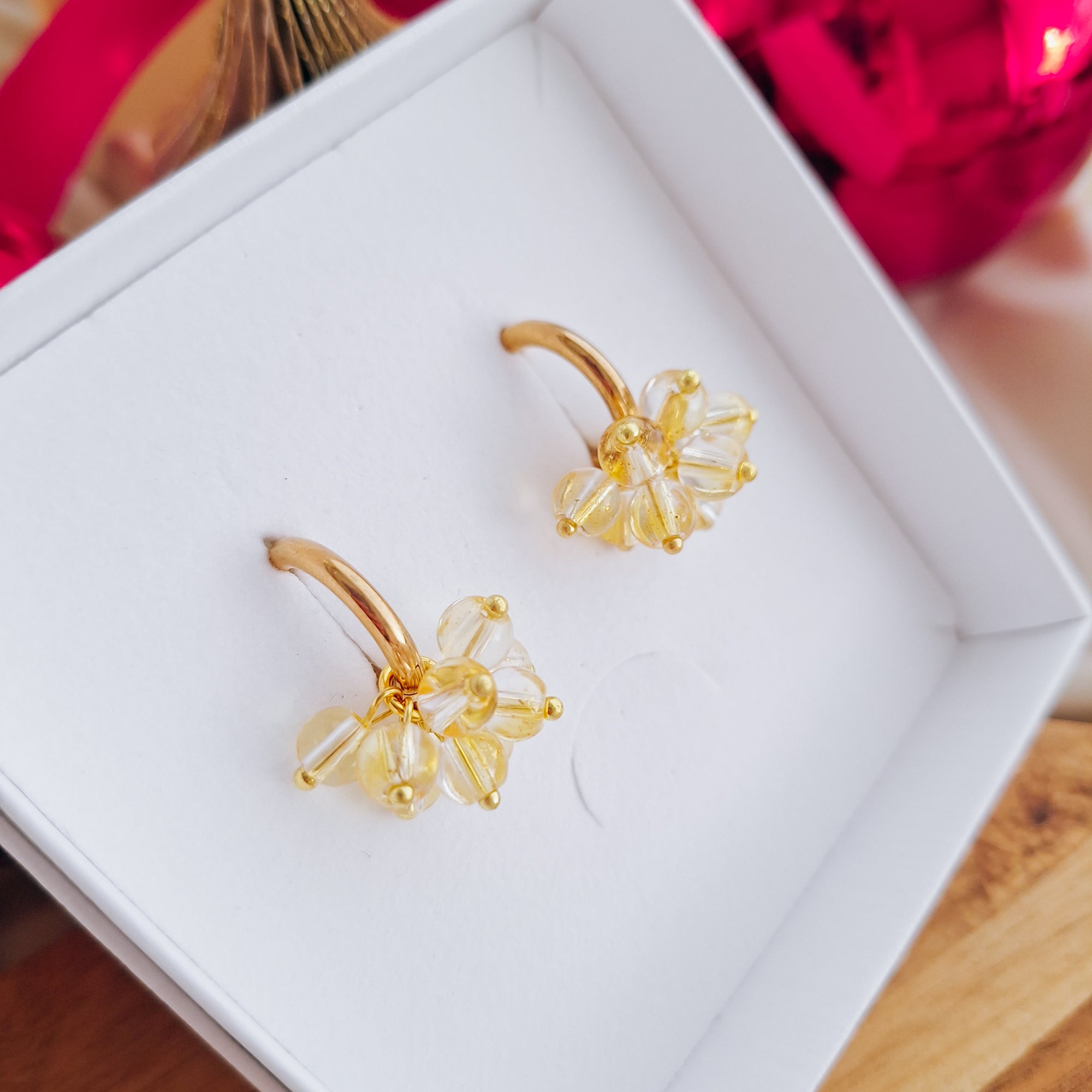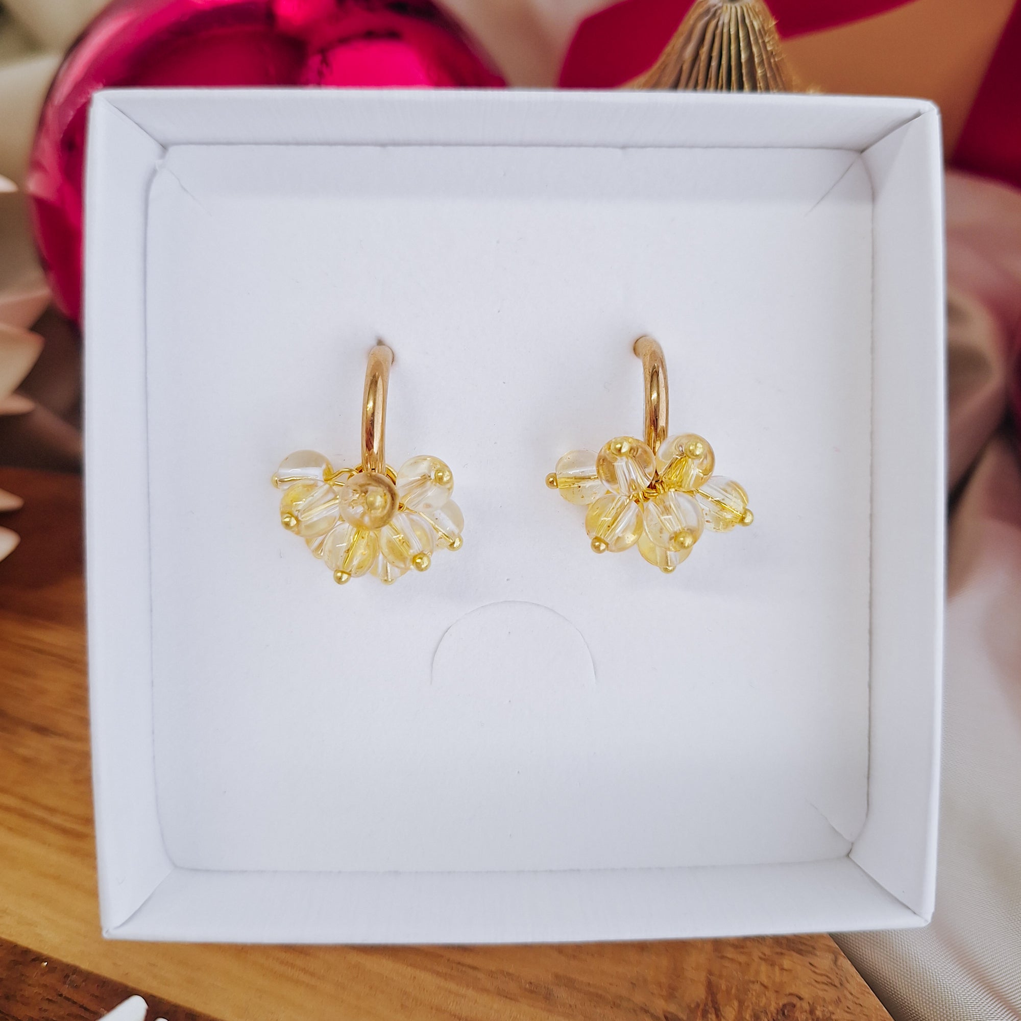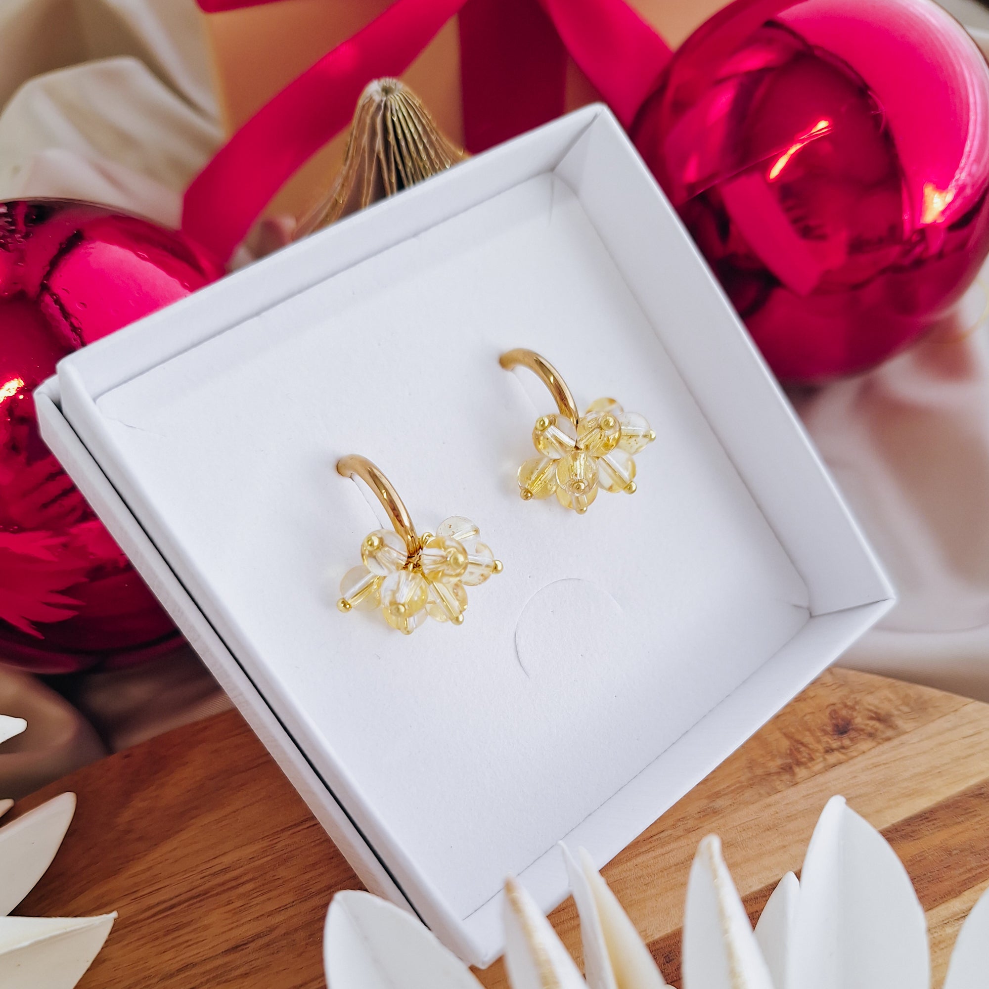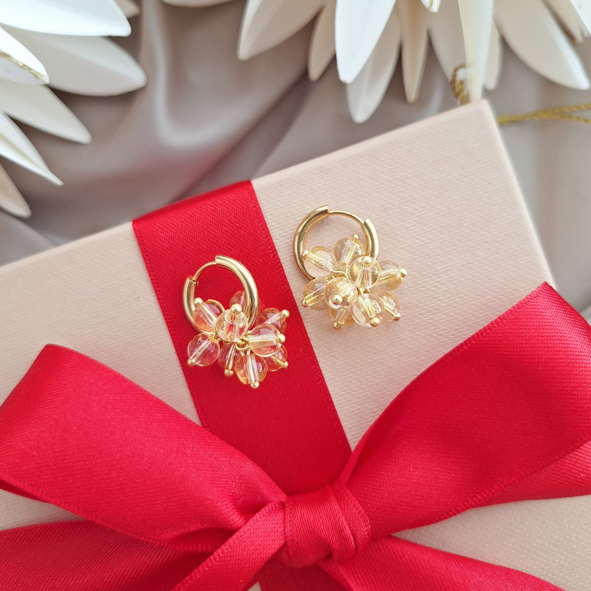 Upeat helmikorvakorut säihkyvillä kullanvärisillä lasihelmillä.