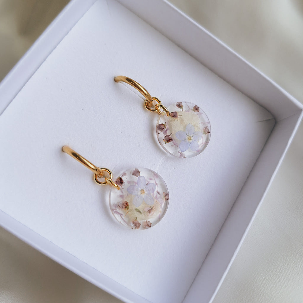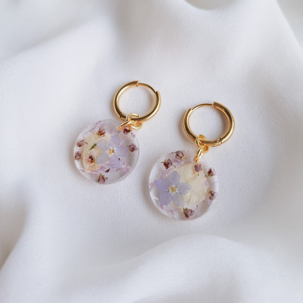 Upeat kuivakukkakorut rengaskiinnityksellä. Sisällä aitoja kuivattuja kukkia, jokainen pari on uniikki! Saatavilla vain yksi pari.